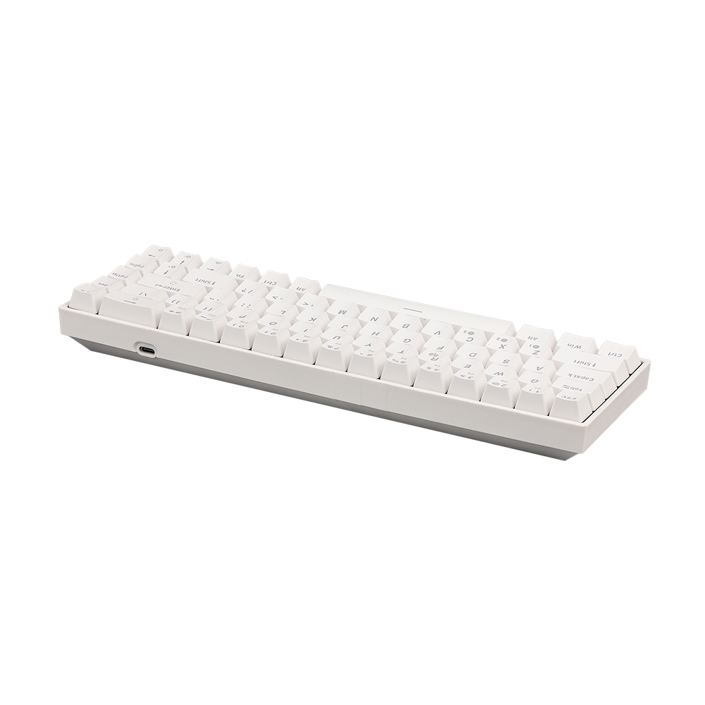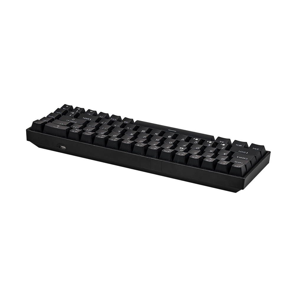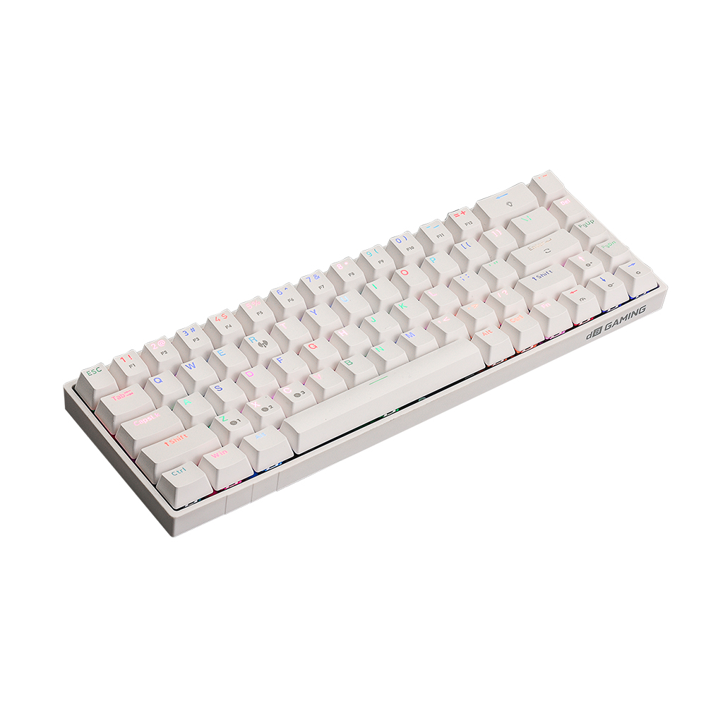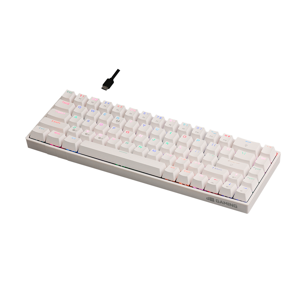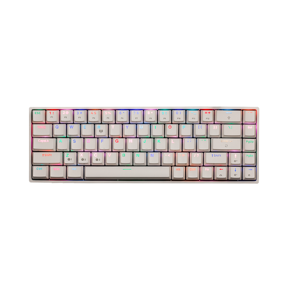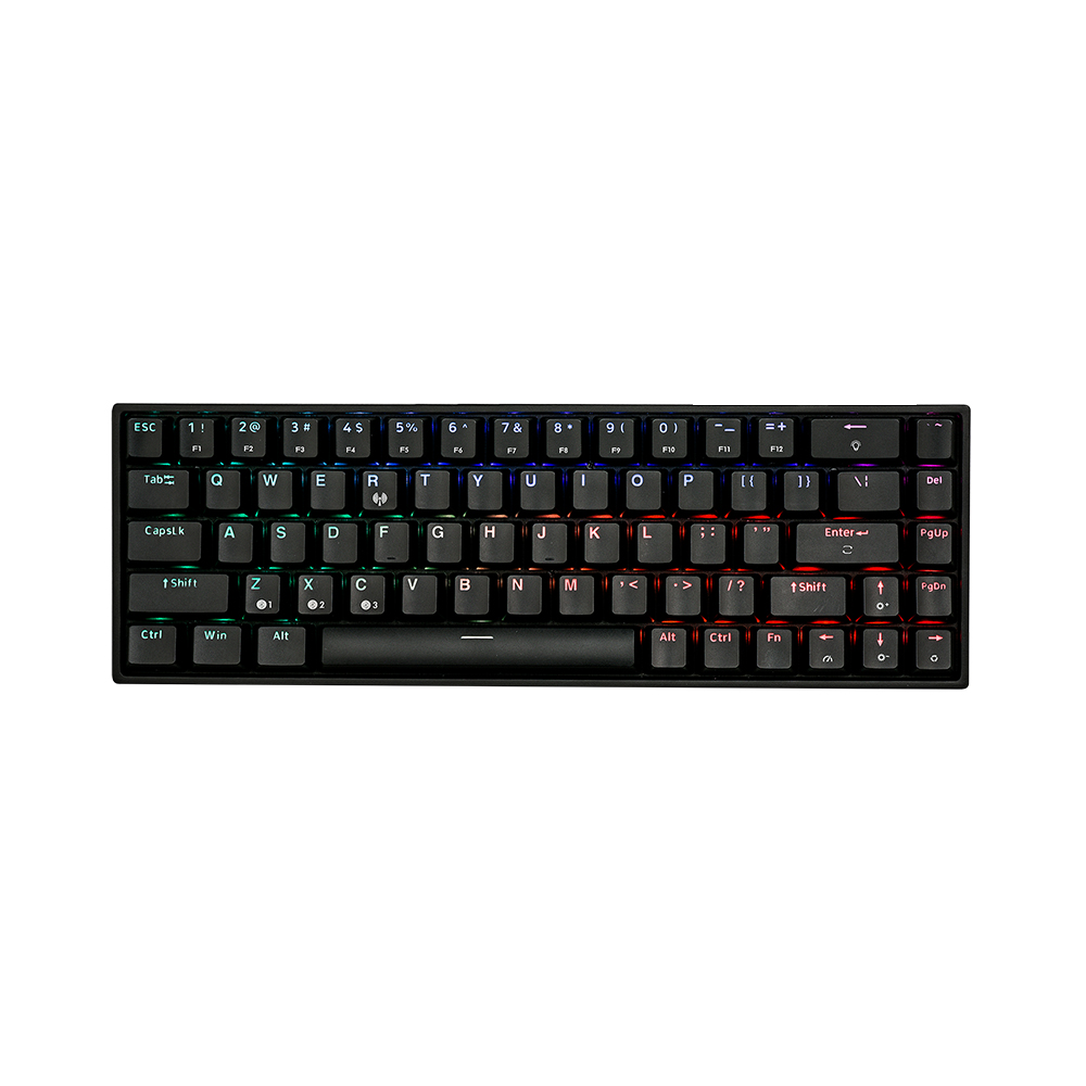 A compact 68-key mechanical keyboard with wired and wireless modes, RGB backlighting, braided detachable cable, metal and ABS construction, hot-swap Outemu switches, and splash-resistant design for everyday gaming sessions comfortably.