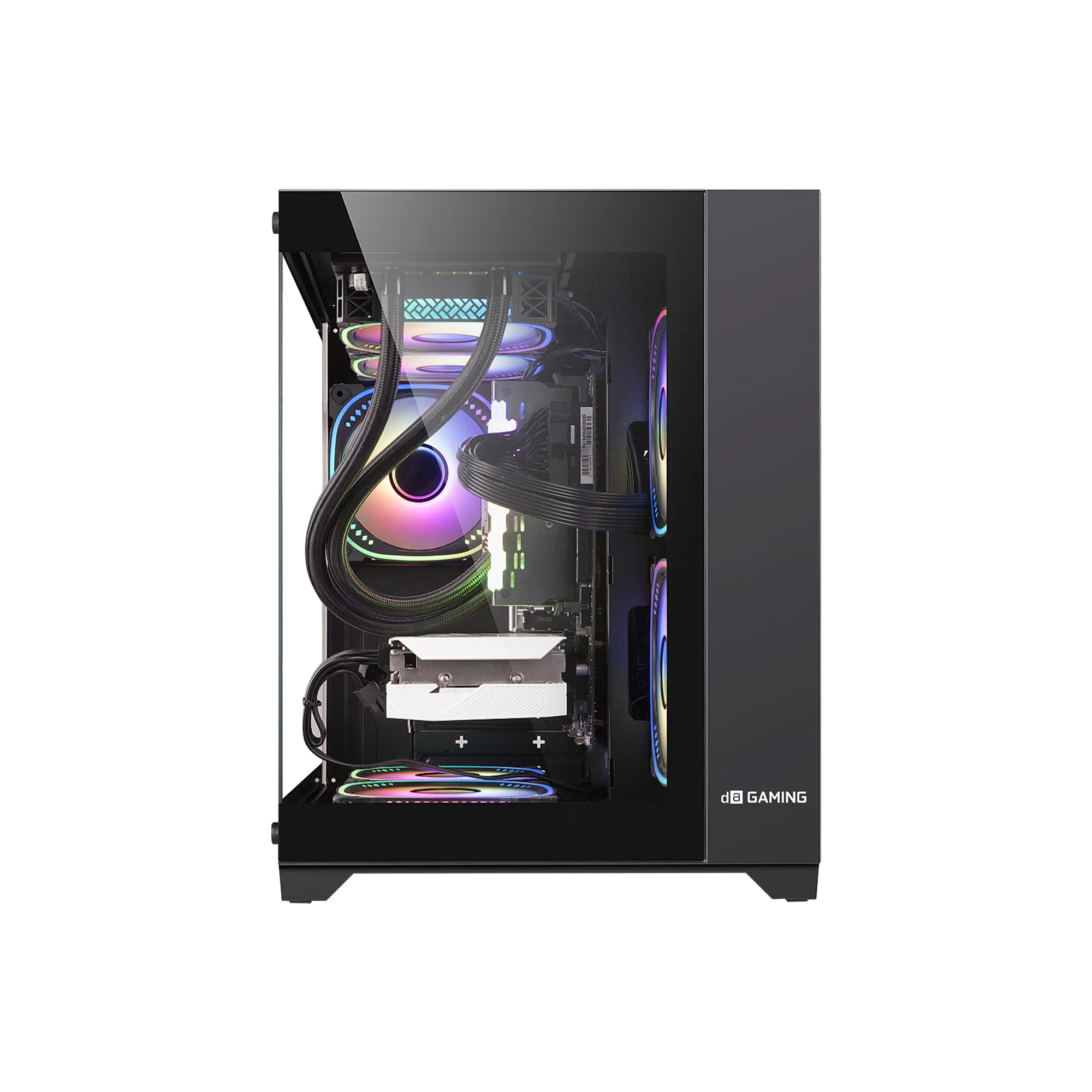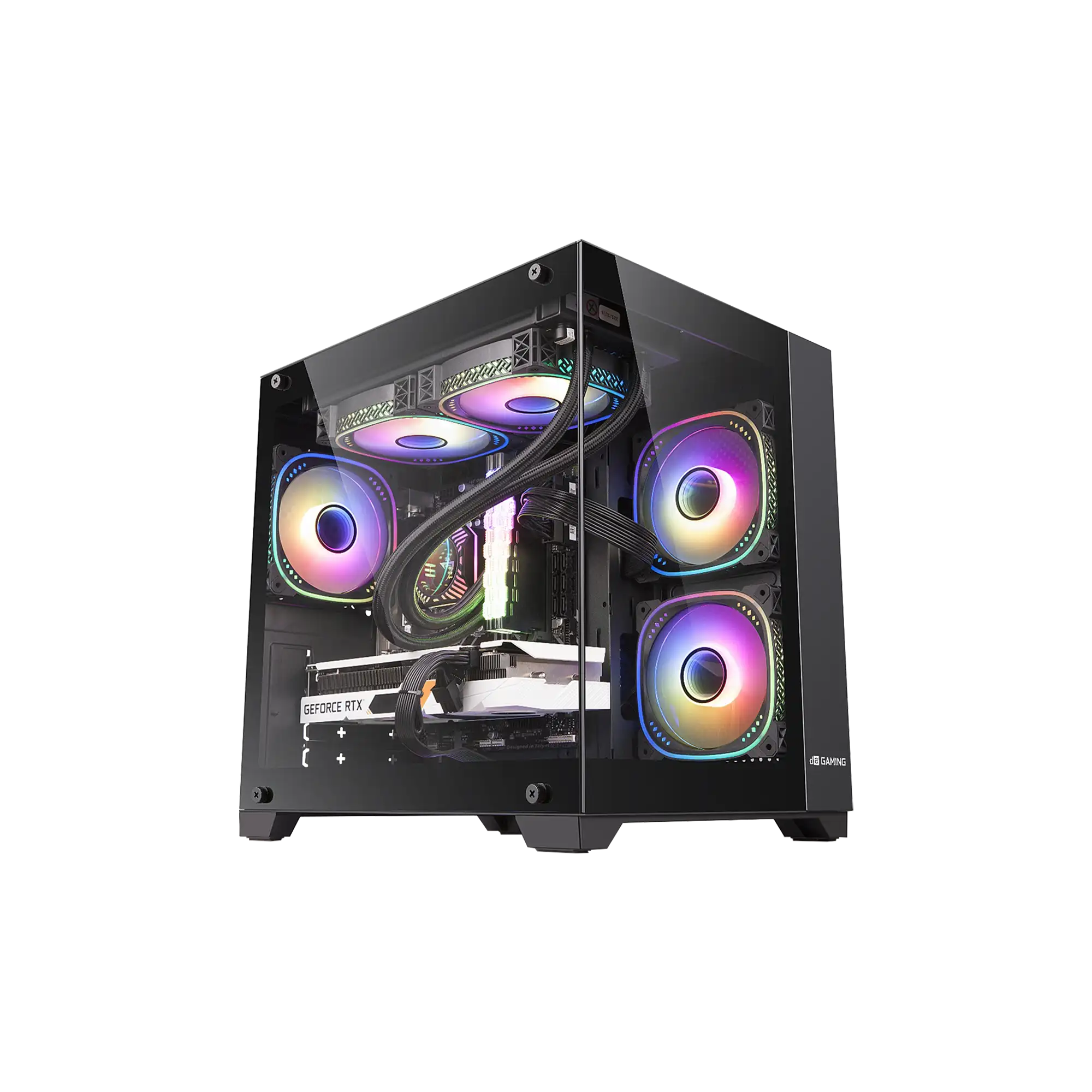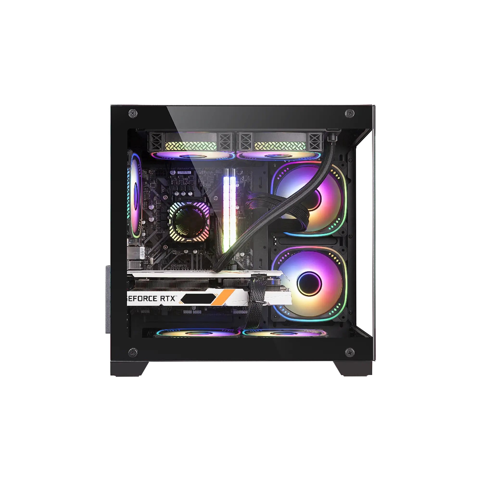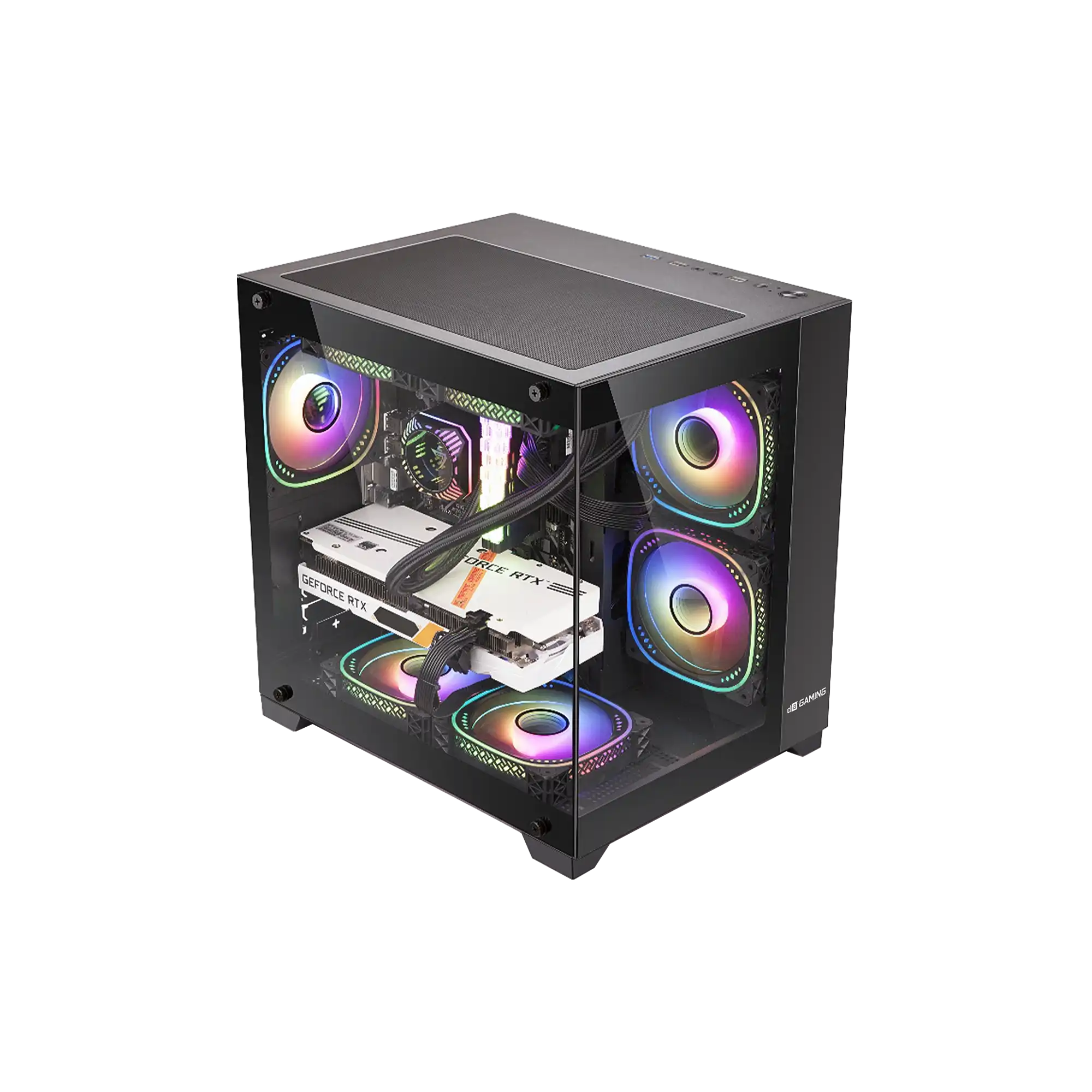 Compact mid-tower case with dual tempered-glass panels for a premium showcase. Supports long GPUs up to 330mm and tall coolers 185mm. Versatile fan mounts, USB-C I/O, and clean cable management.