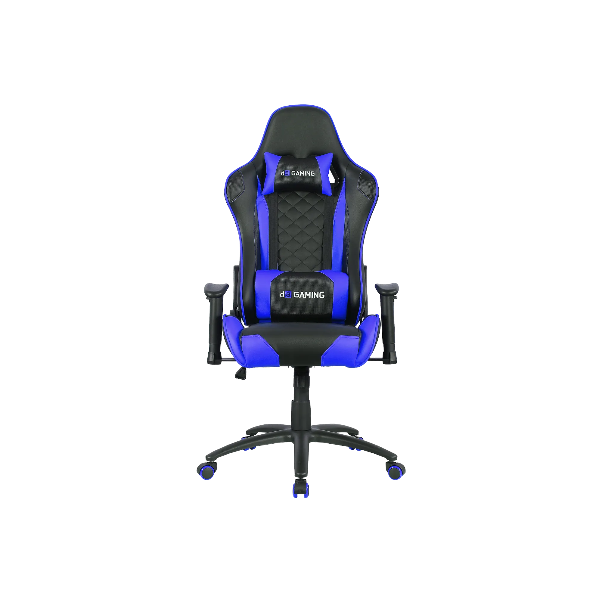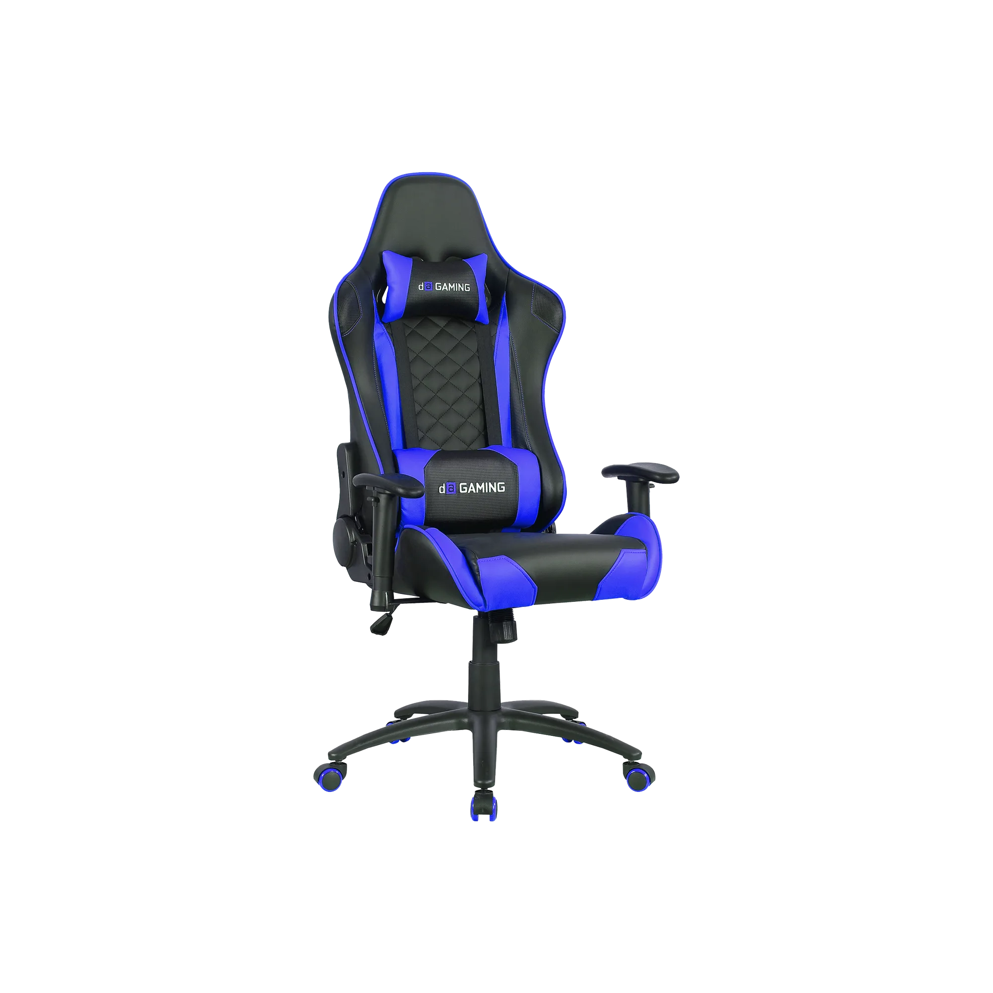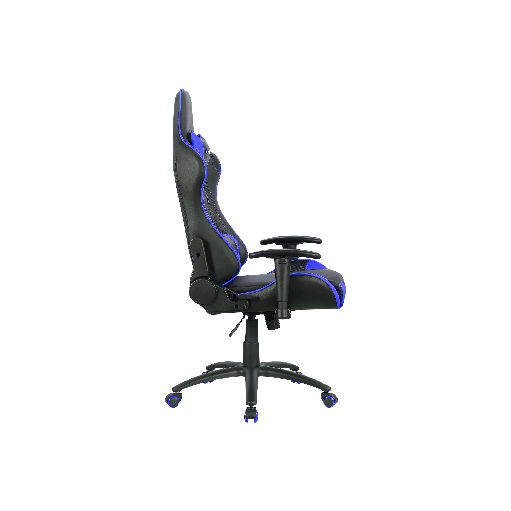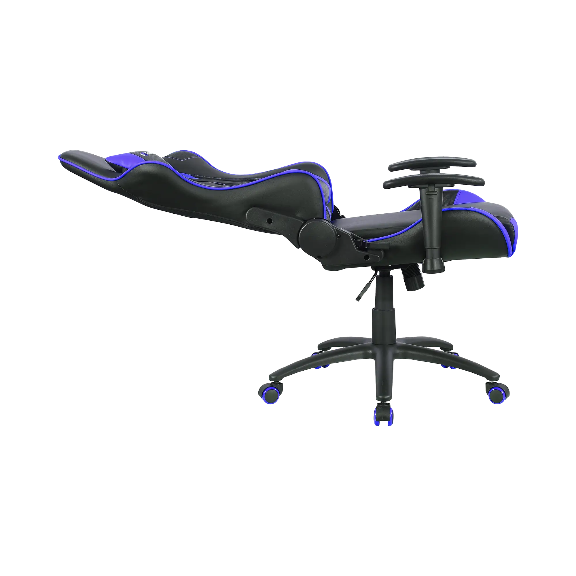 The Throne gaming chair offers high-density foam, metal frame, 2D armrests, 90–180° reclining backrest, Class 4 gas lift, and 150kg support, available in blue, red, or black for versatile setups.