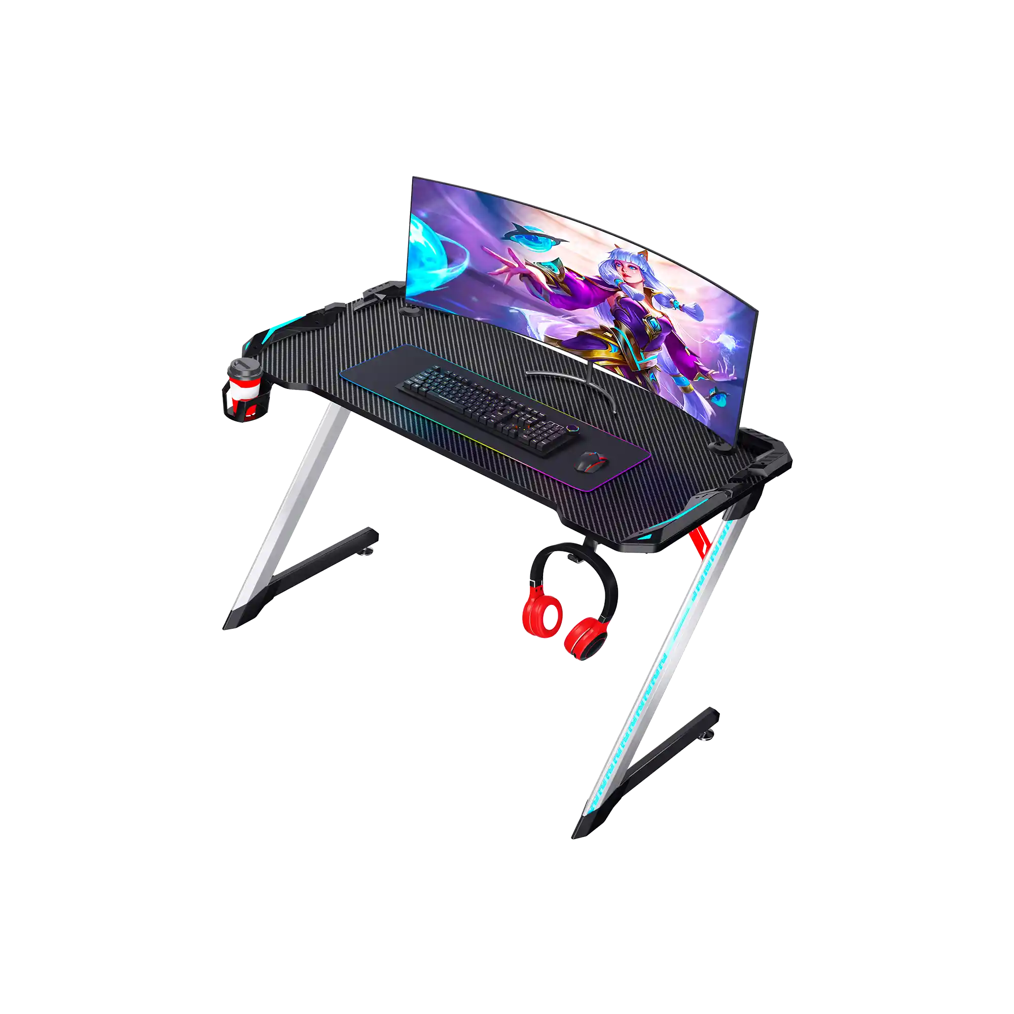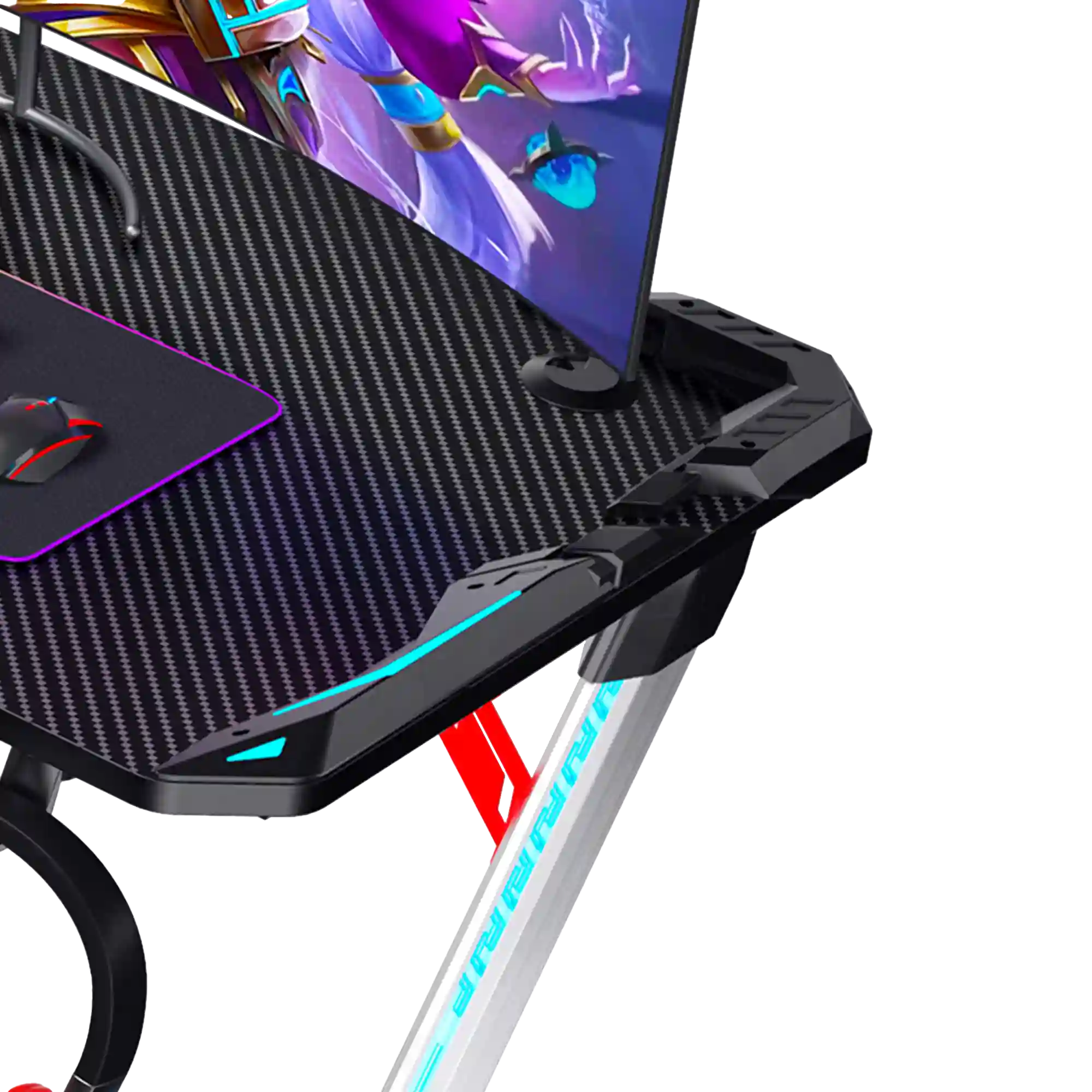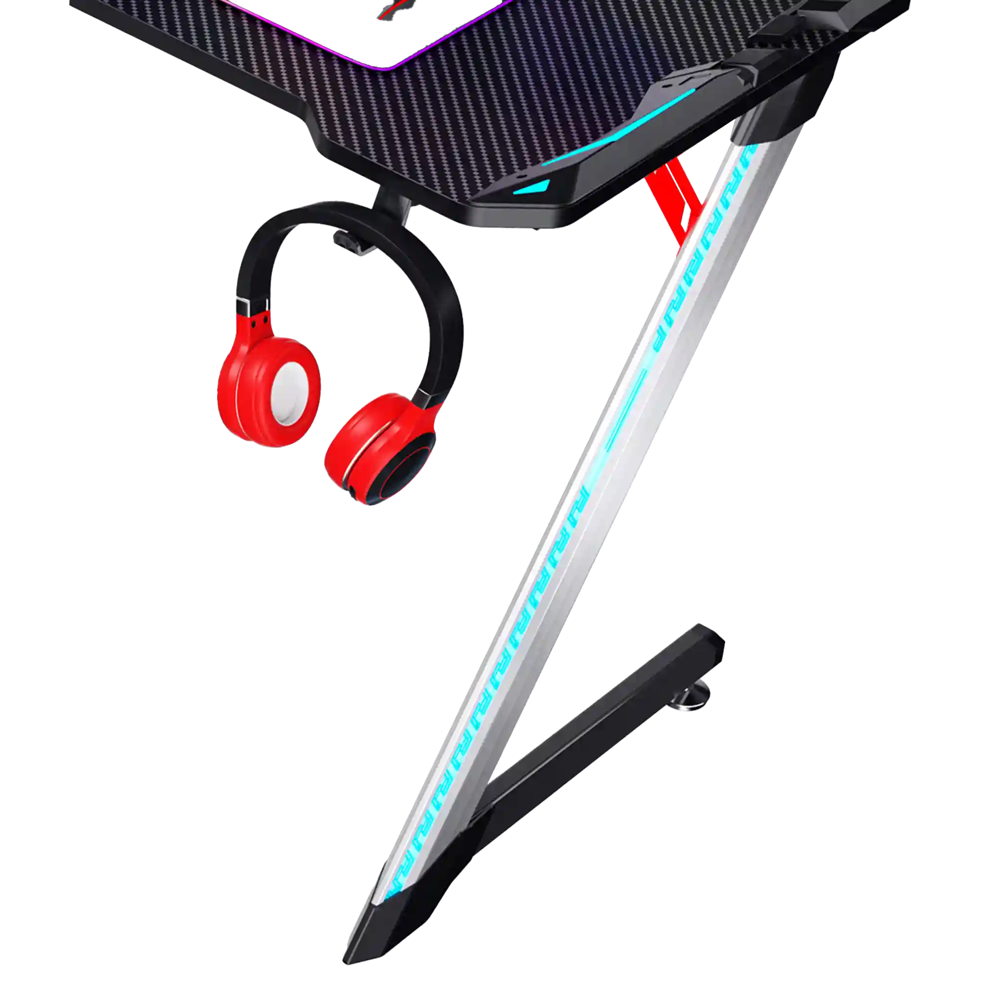 18mm Carbon Fiber Texture Tabletop, Aluminium Alloy Legs, 4-Area RGB Lights, Headset Hook, Cup Hook, Socket Storage Bin